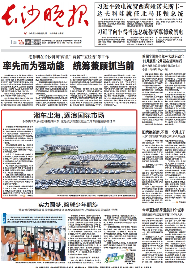 《長(zhǎng)沙晚報(bào)》(2024年5月22日 第一版) 湘車出海,逐浪國(guó)際市場(chǎng)840輛汽車從長(zhǎng)沙乘船闖中東,這是長(zhǎng)沙新港發(fā)運(yùn)出口汽車數(shù)量最多的訂單