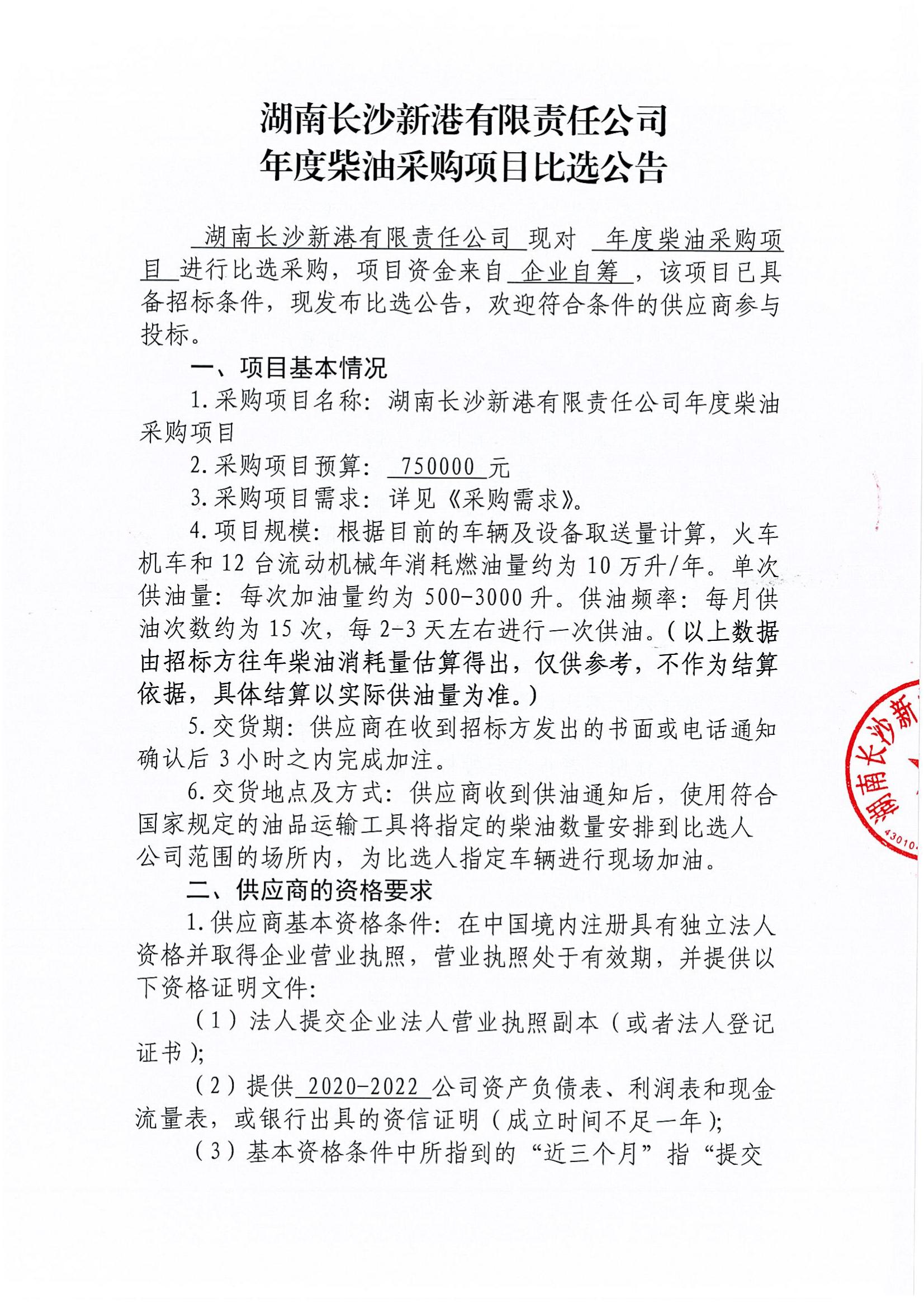 湖南長(zhǎng)沙新港有限責(zé)任公司年度柴油采購(gòu)項(xiàng)目比選公告