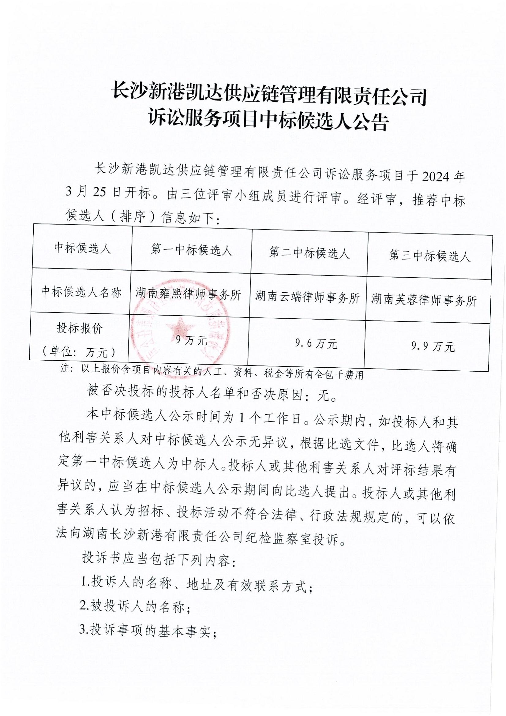 長沙新港凱達(dá)供應(yīng)鏈訴訟服務(wù)項目中標(biāo)候選人公告
