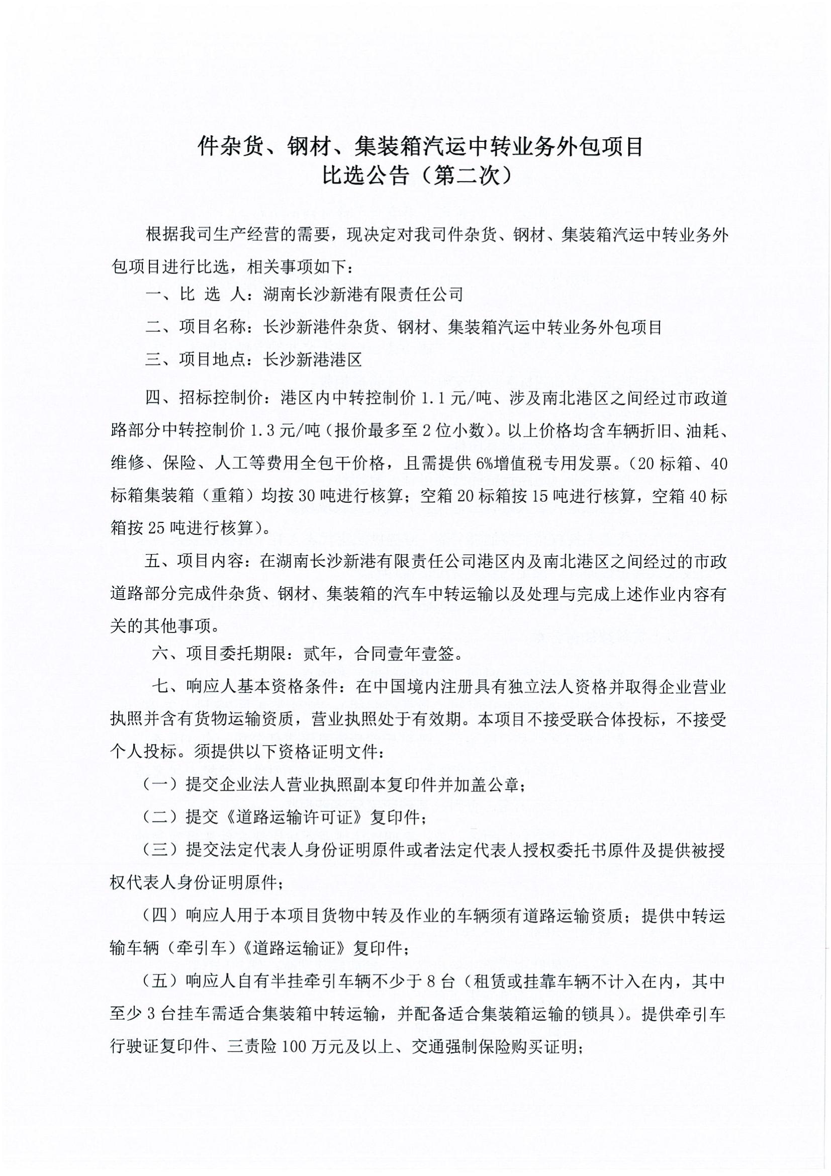 件雜貨、鋼材、集裝箱汽運中轉(zhuǎn)業(yè)務(wù)外包項目比選《比選公告(第二次)》